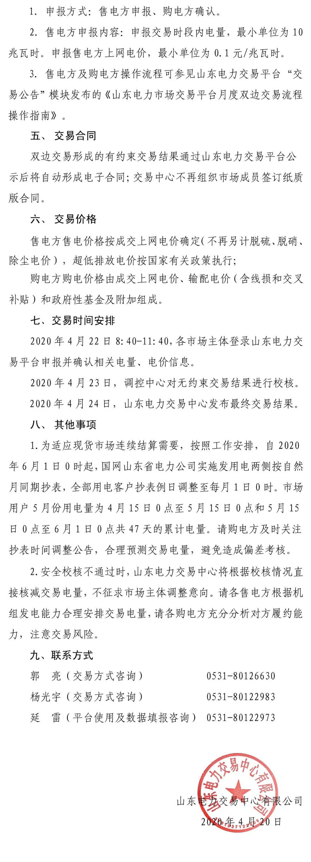 根據《關于做好2020年全省電力市場交易有關工作的通知》(魯發改能源〔2019〕1164號)、《關于修訂山東省電力中長期交易規則有關條款的通知》(魯監能市場〔2019〕131號)等文件要求,山東電力交易中心有限公司定于近期開展山東省2020年5月份電力直接交易(雙邊協商),交易公告如下: